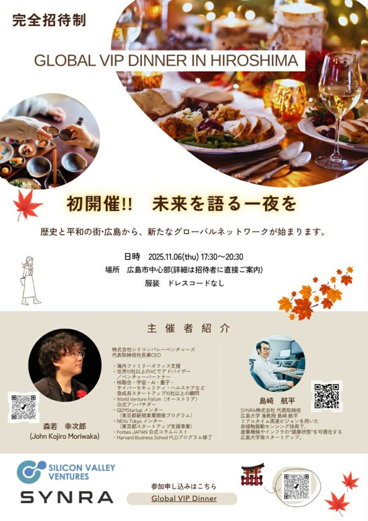 件名に「広島VIPディナー参加希望」、本文に「所属・氏名・どのように本イベントを知ったか」をご記載の上、シリコンバレーベンチャーズ運営事務局(info@siliconvalleyventures.site)までメールにてご連絡ください。
